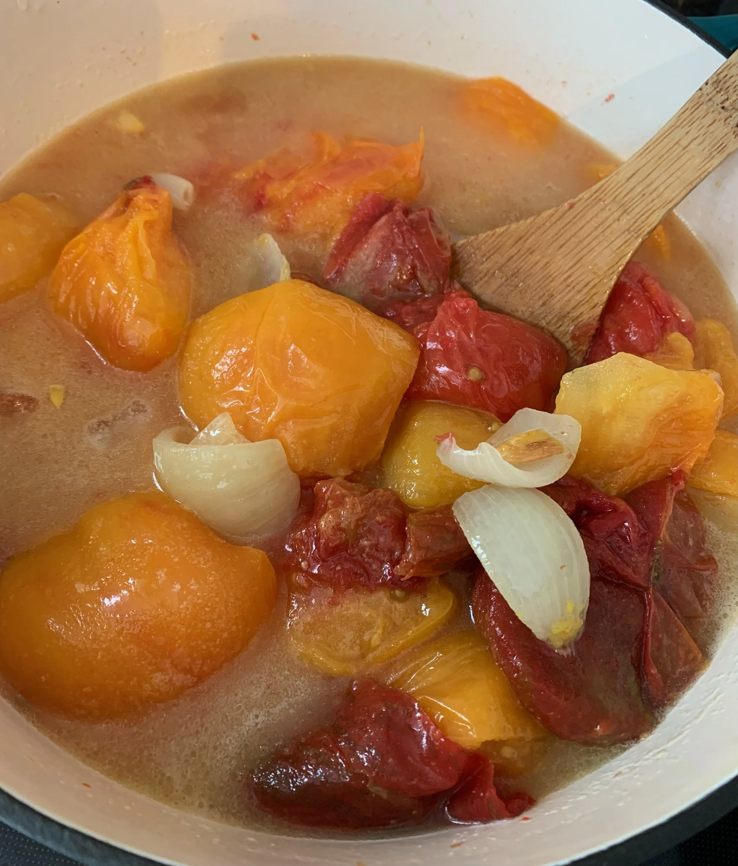 Add a 1 gallon bag of Frozen Heirloom Tomatoes (you may purchase these in our freezer at the farm stand) to your pot and thaw or if they are partially frozen add the juice to the pot along with the tomatoes.