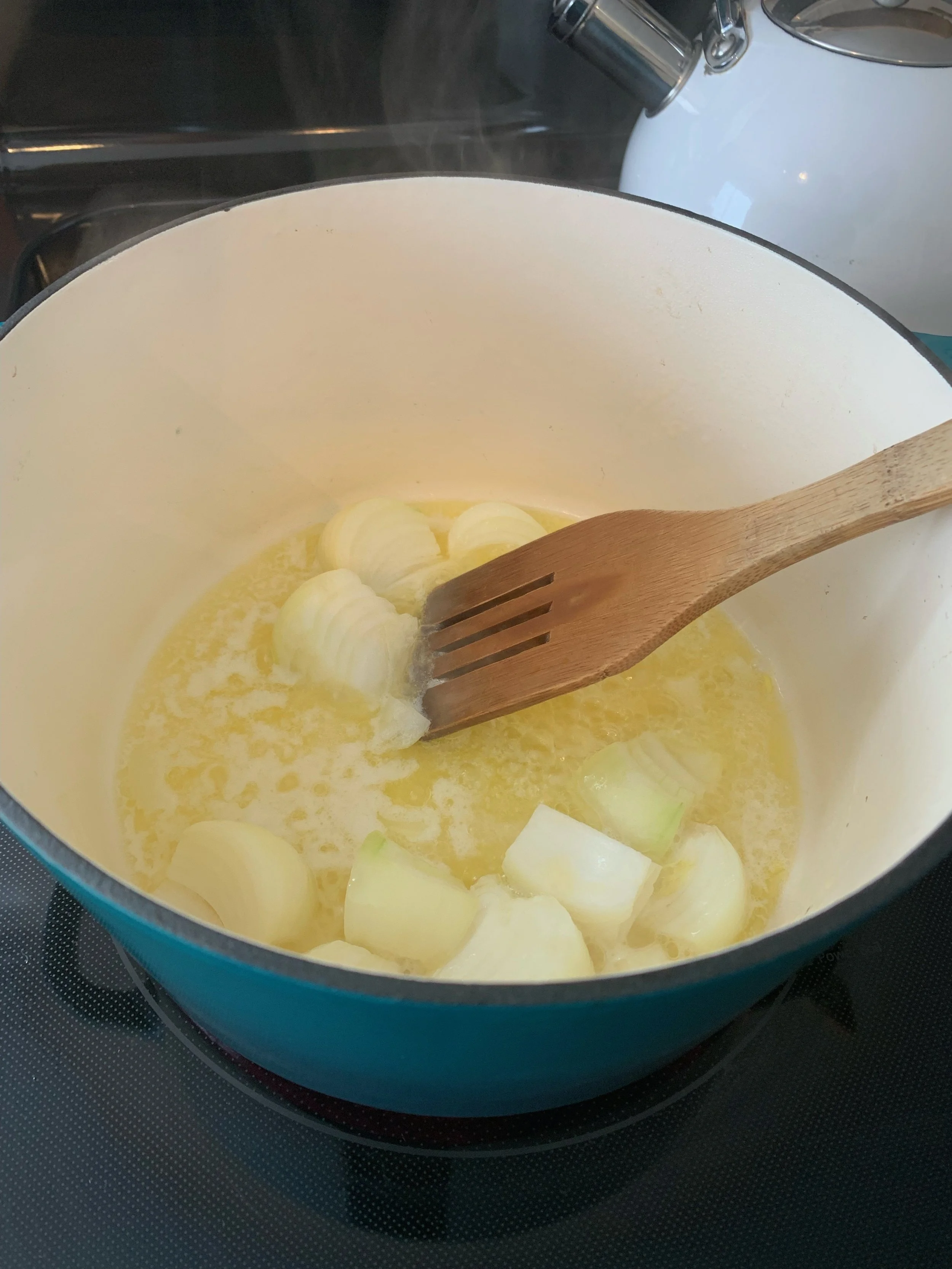 To Start: Join me by placing 6 tbsp of Butter in a dutch oven. Melt the butter and add a medium onion. Saute till the onions are soft and the butter is browned a bit. This is the time to add wine if you like to cook with wine. 1/4 cup of White Wine. Stir to loosen the browned bits that may be attached to the bottom of your pot.